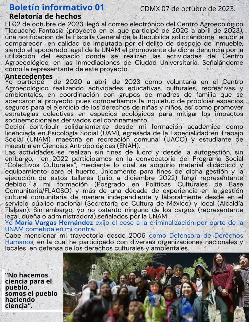 “Nosotros, estamos en la disposición de cooperar, no creemos que sea necesario este desgaste jurídico, lo único que quisiéramos es que se acercaran a conocer lo que se ha construido en el espacio y si es que no existe posibilidad de que permanezcamos estaremos dispuestos a cooperar, pero si es un hecho que a nosotros nos están ‘despojando’ de este espacio, pues es un acto violento que sin diálogo y por medio de demandas, señalándonos como un delito Federal, una institución pública se dirija a nosotros como estudiantes. Hay un abuso desproporcional de poder que nos está afectando de manera económica, social y emocional”, expresó un voluntario del Tlacuache Fantasía.