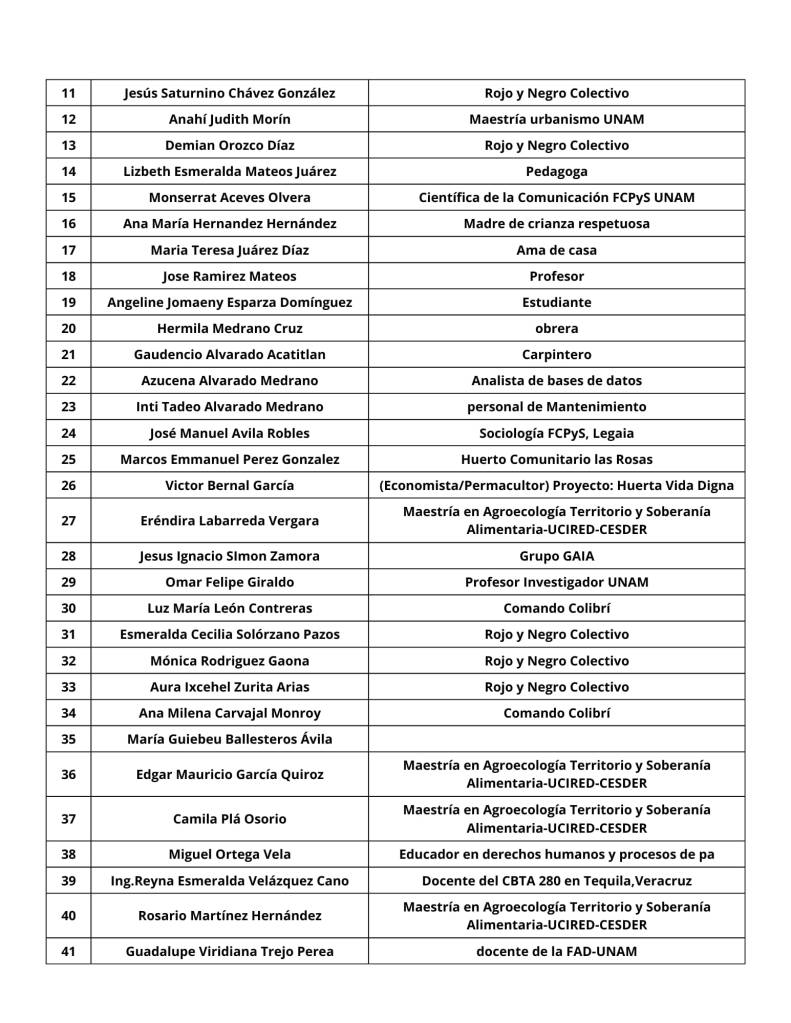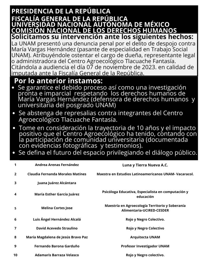 El apoyo se ha manifestado a través de la firma de un pronunciamiento que ya reúne por lo menos más de 200 firmas por colectivos, organizaciones sociales, estudiantes, personal administrativo y profesores hacia el espacio Centro Agroecológico Tlacuache Fantasía, así como a la compañera exvoluntaria María Vargas Hernández. Actualmente se está realizando una rifa con premios artesanales y naturales donados por la comunidad para solventar los gastos que han representado el acceder a una defensa jurídica.
